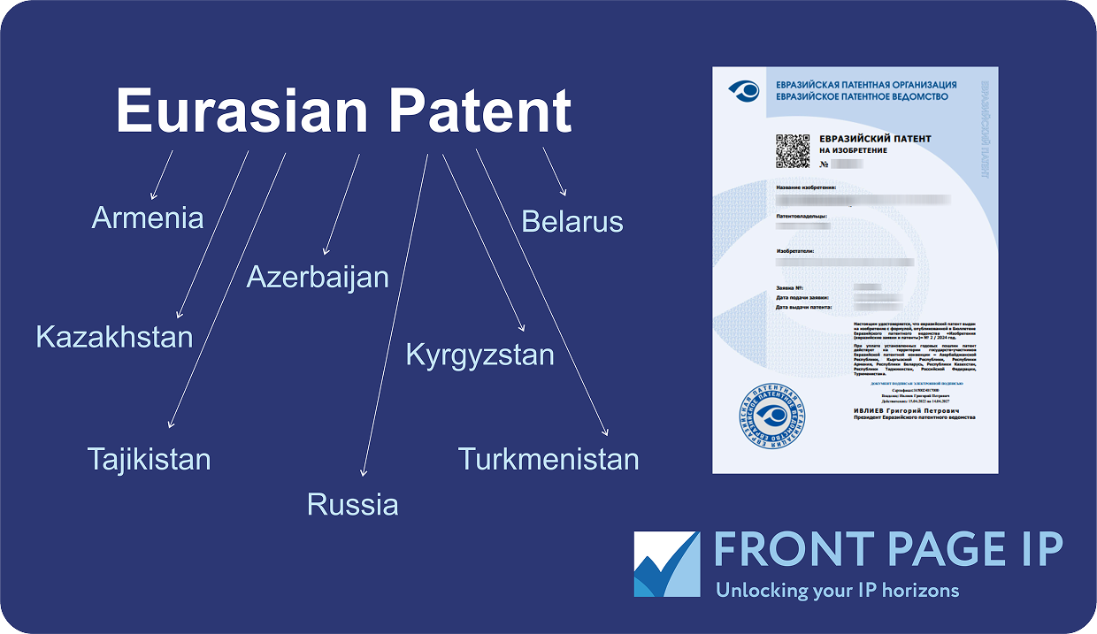 Less popular is Eurasian Patent Organization (EAPO) that also covers large territory: Armenia, Azerbaijan, Belarus, Kazakhstan, Kyrgyzstan, Russia, Tajikistan, and Turkmenistan